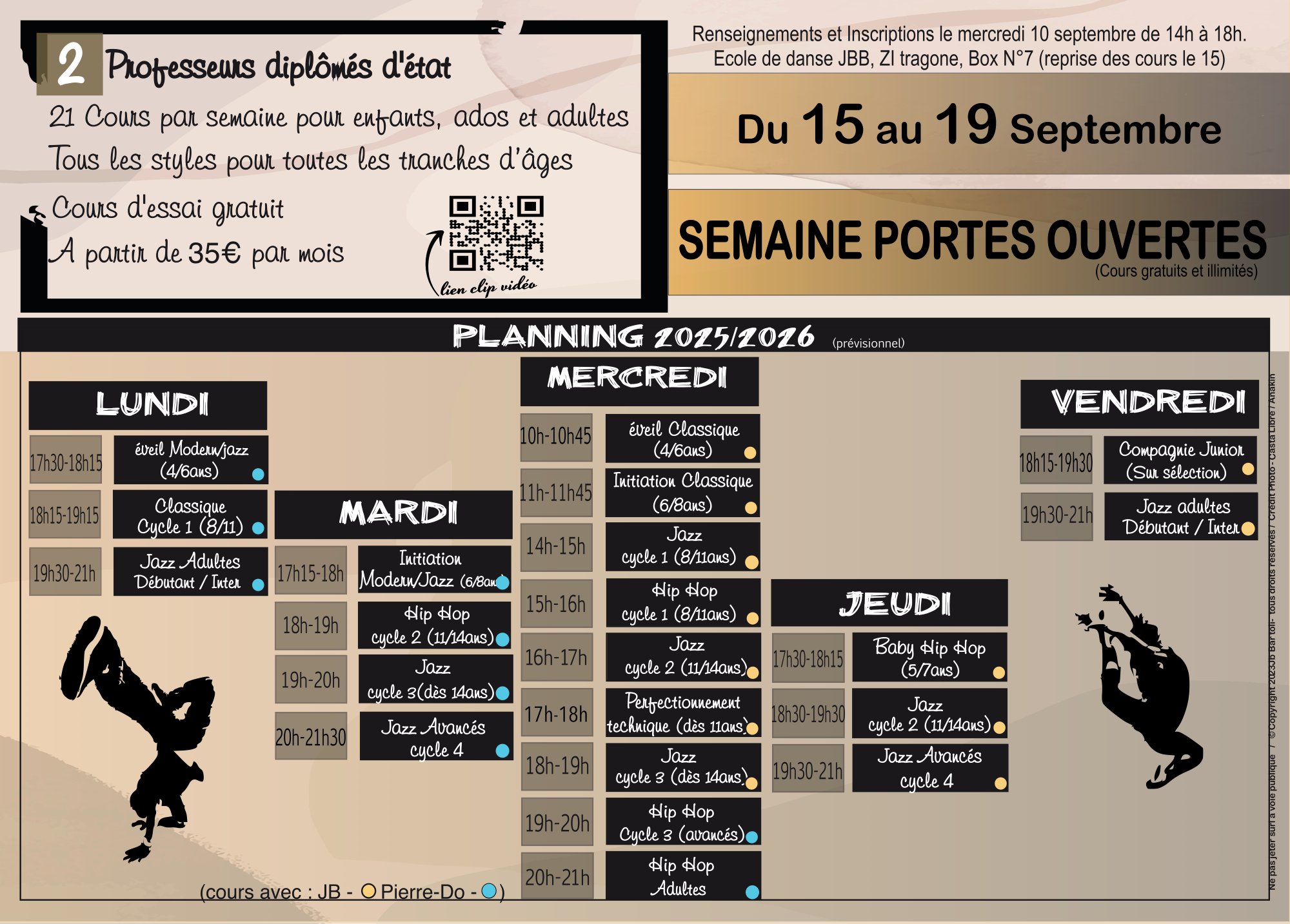Planning (sous réserve de modification) Planning 2025/2026 école de danse jbb Partager : Cliquez pour partager sur Facebook(ouvre dans une nouvelle fenêtre) Facebook Cliquer pour partager sur X(ouvre dans une nouvelle fenêtre) X